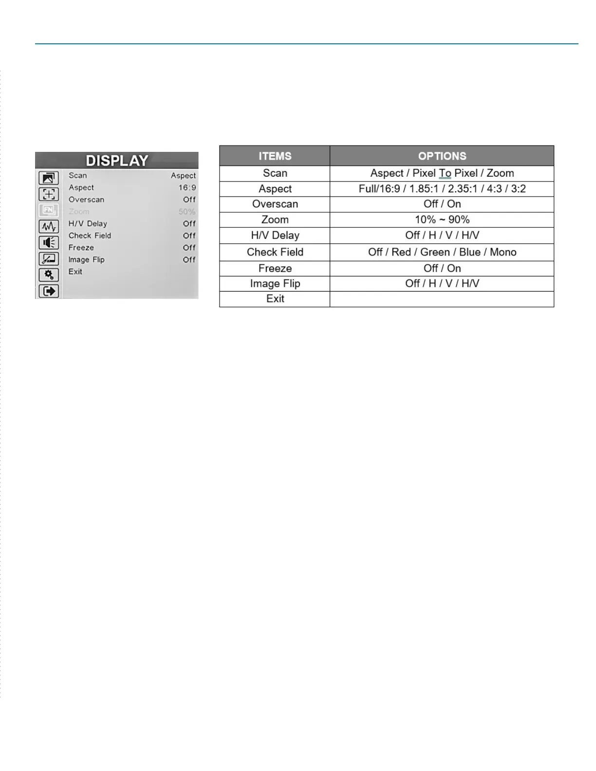 Scan – Adjust the scan mode among [Aspect], [Pixel To Pixel], [Zoom].