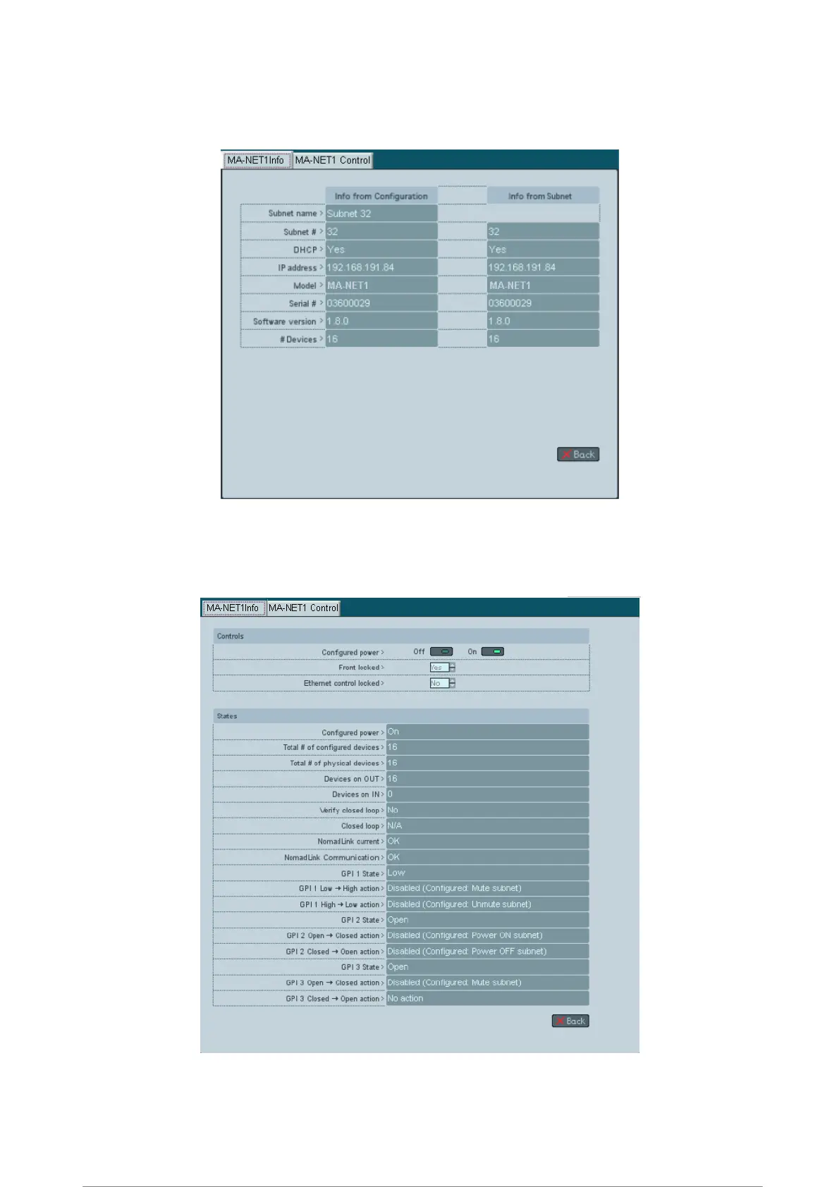 The MA-NET1 Control tab displays information on the MA-NET1 configuration and subnet status. The Power