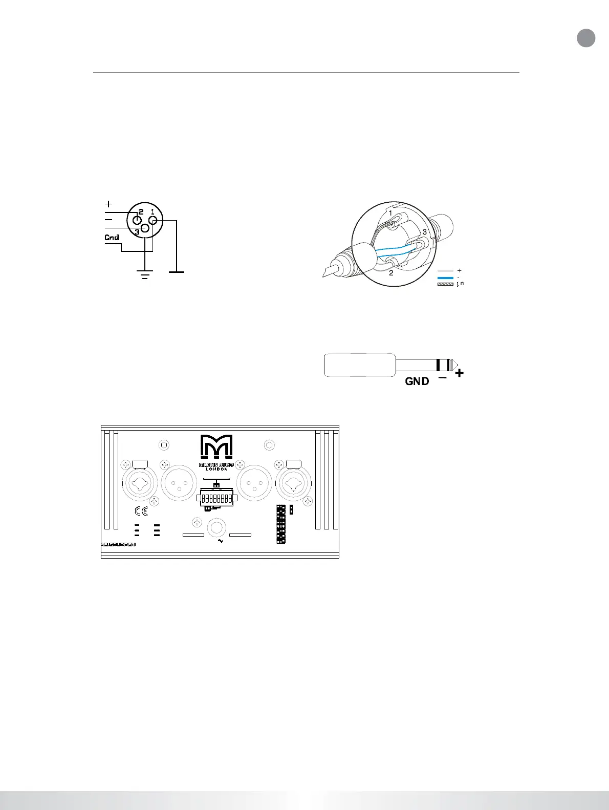 Must be grounded XLR Pin 1 Scrn Sleeve 2 Pos Tip 3 Neg Ring 1/4“