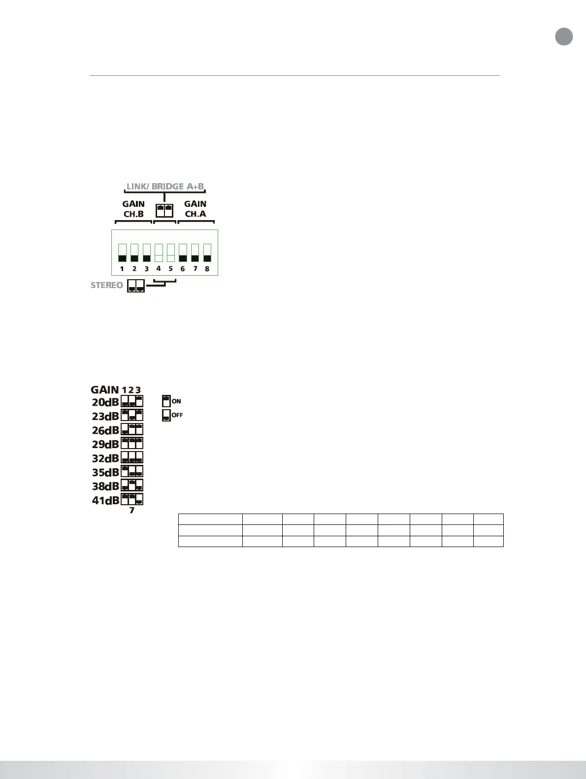 T p6-he g ain switch loca te d o n th e rea r p an el (the ce ntra l D IP -sw itch ) cha ng e s th e g ain/inp ut se nsitivity o f the am plifier.