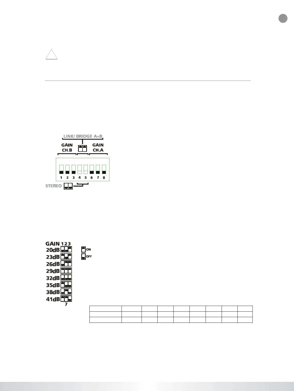 T p6-he g ain switch loca te d o n th e rea r p an el (the ce ntra l D IP -sw itch ) cha ng e s th e g ain/inp ut se nsitivity o f the am plifier.