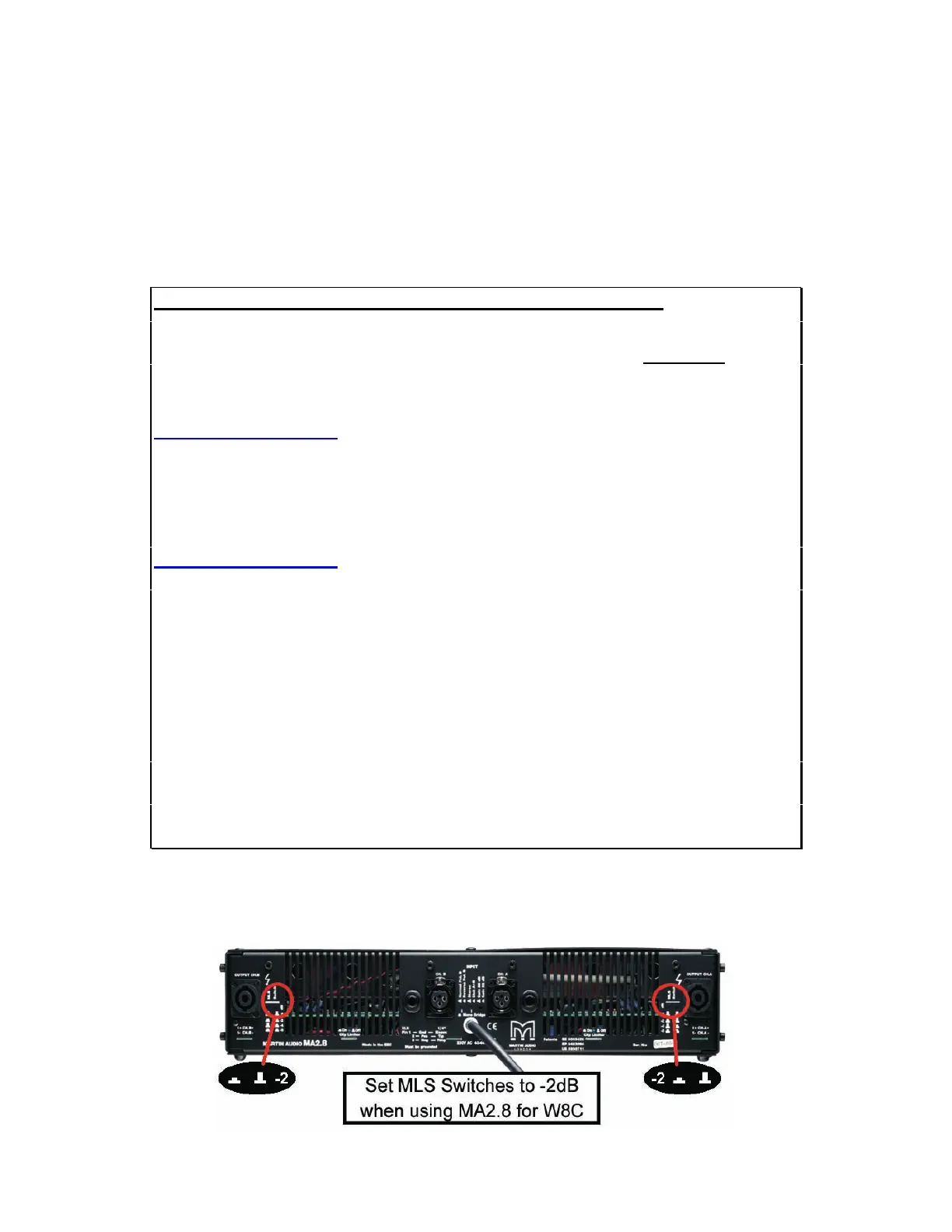 * Set Martin Audio MA2.8 rear MLS switch to -2dB to match peak output of