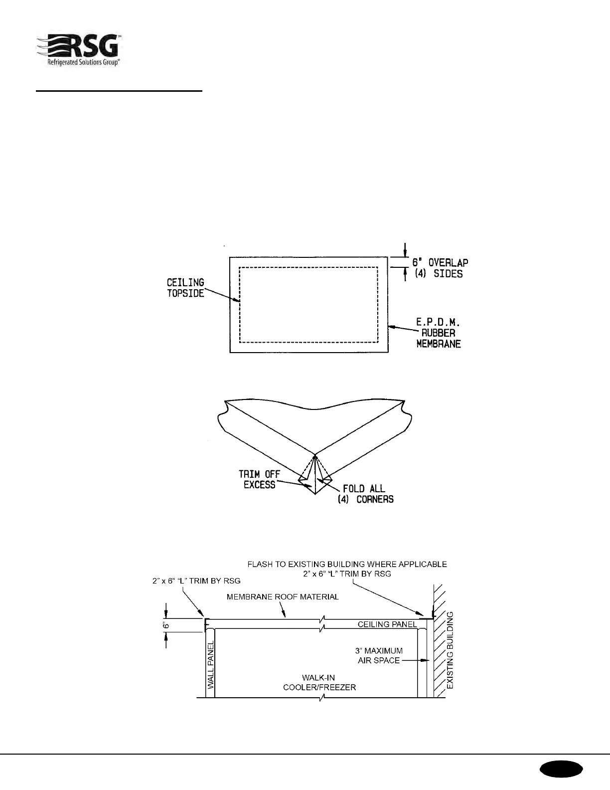 After walk-in is completely assembled, lay E.P.D.M. over ceiling topside and trim to a 6" overlap on all four sides.