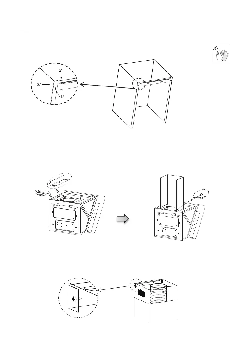 ● Fix the upper chimney onto the bracket 21 with 2 screws 12 (4.2 x 9.5) supplied with the hood.