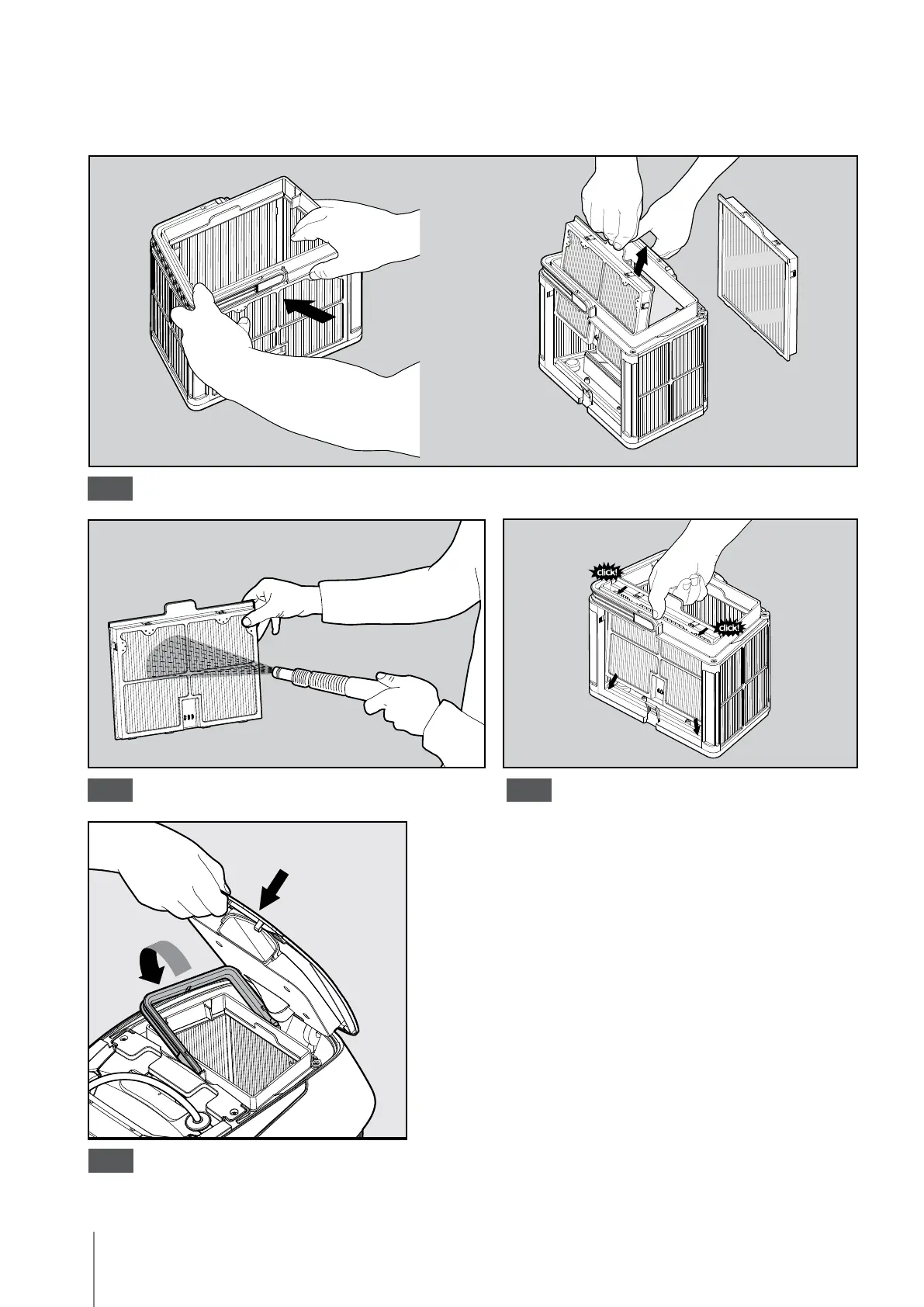 Demonteer de 2 ultrafijne filter panelen van de korf op de volgende manier:
