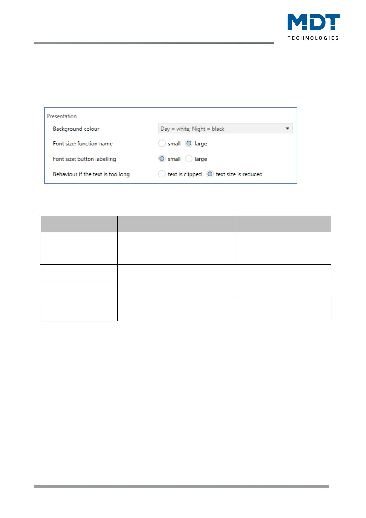 Table 8: Display settings – Presentation