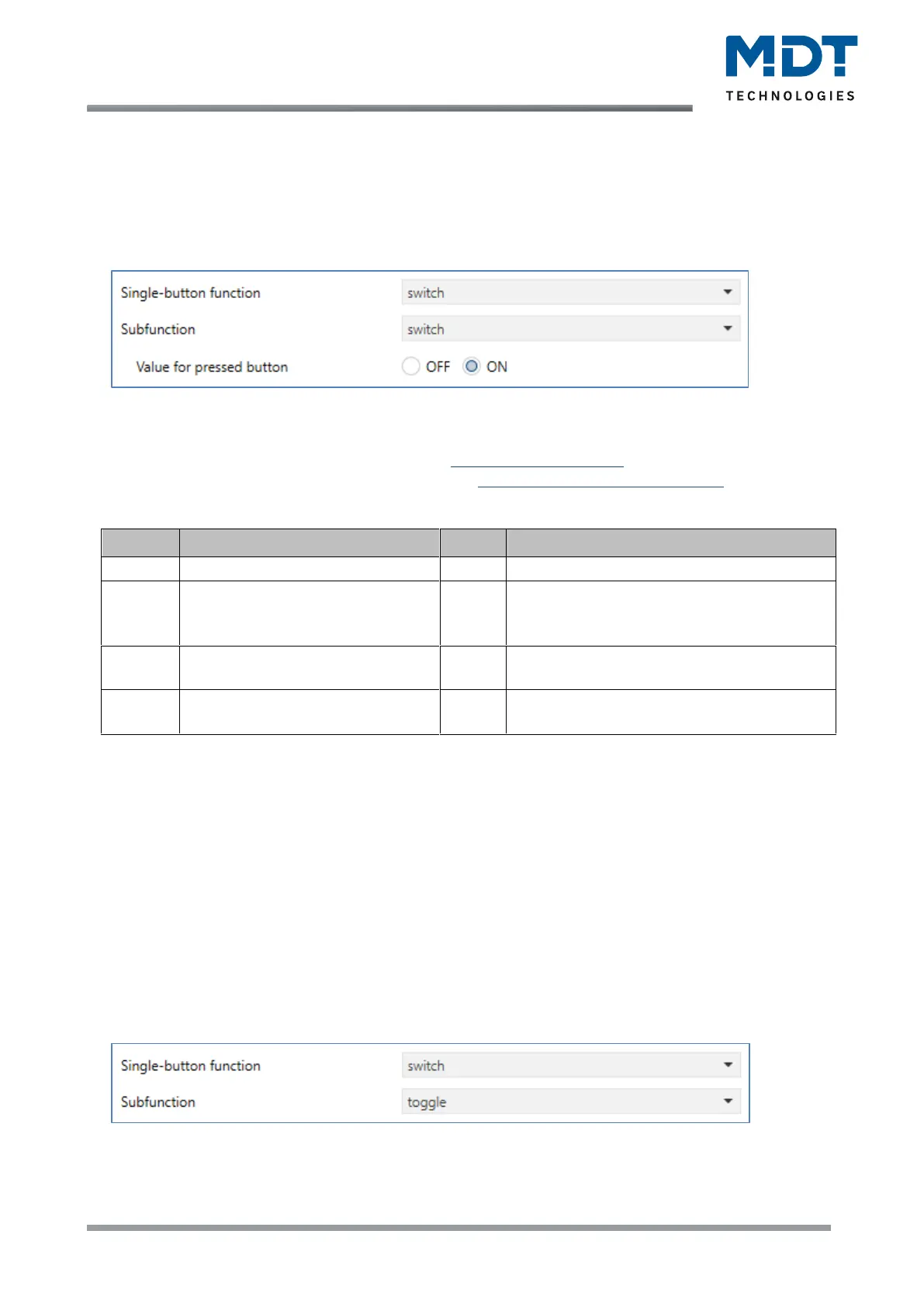Table 28: Communication objects – Single-button function: Switch - Subfunction: Switch