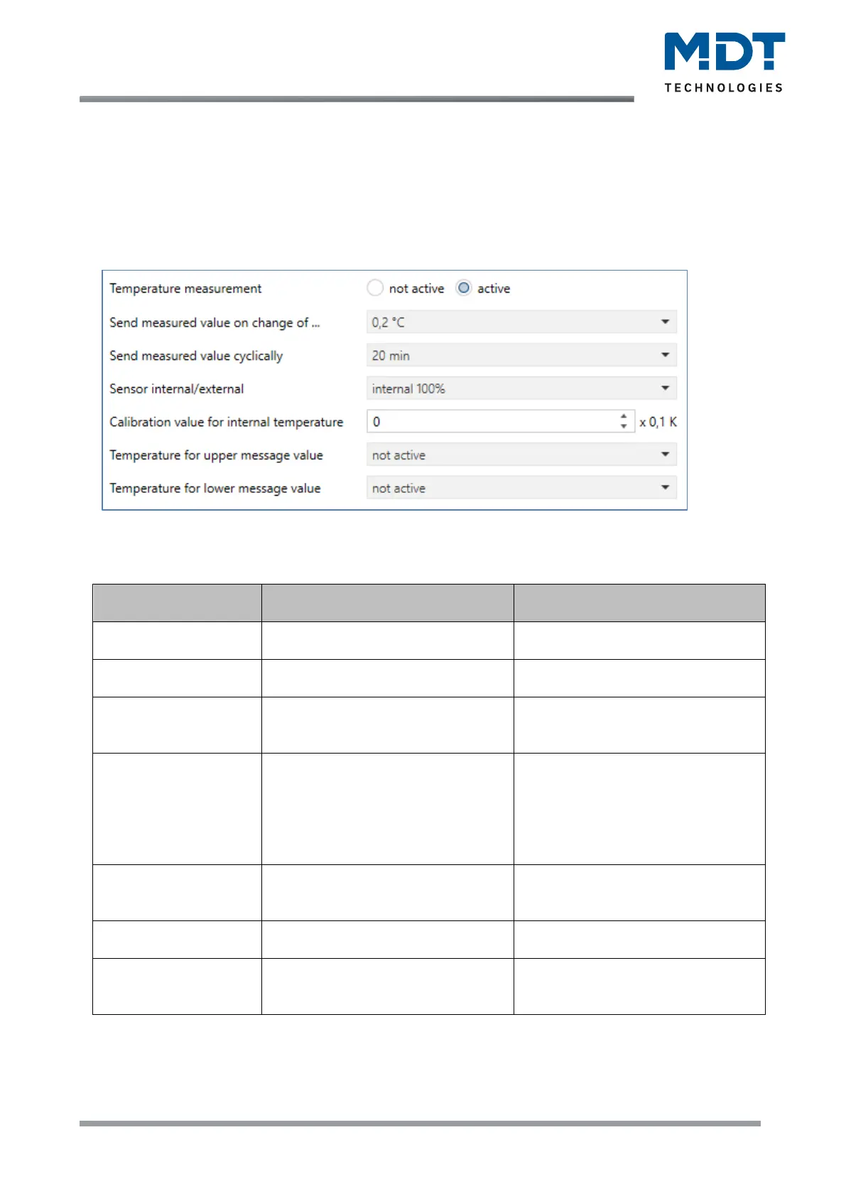 Table 77: Settings – Temperature measurement