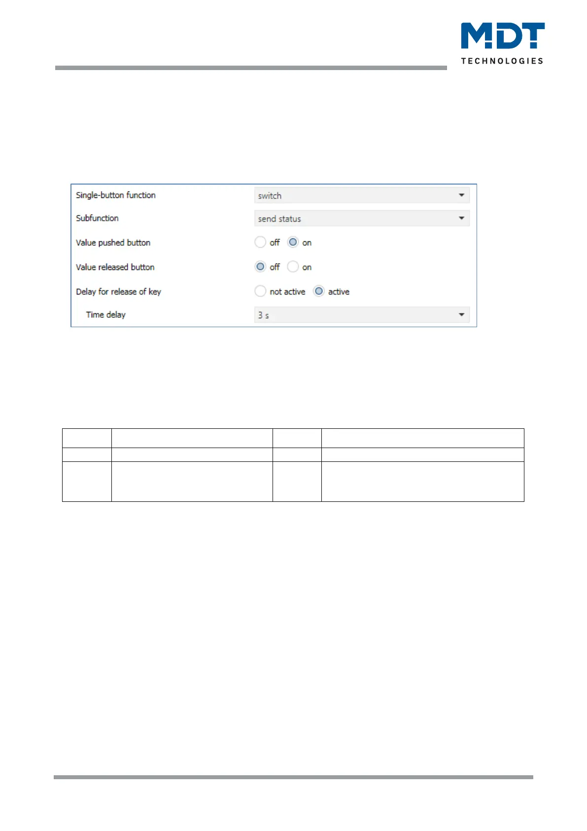 Table 26: Communication objects – Single-button function: Switch - Subfunction: Send Status