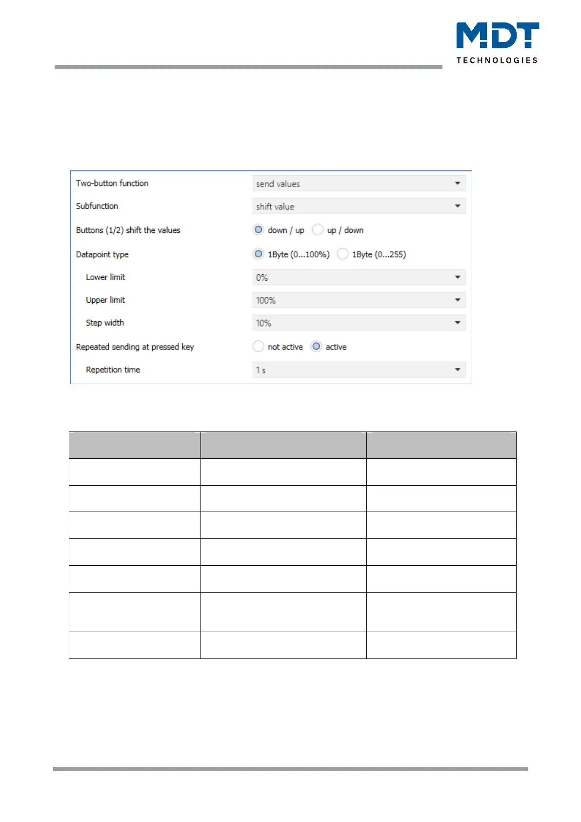 Table 31: Settings – Send Values - Subfunction: Shift Values