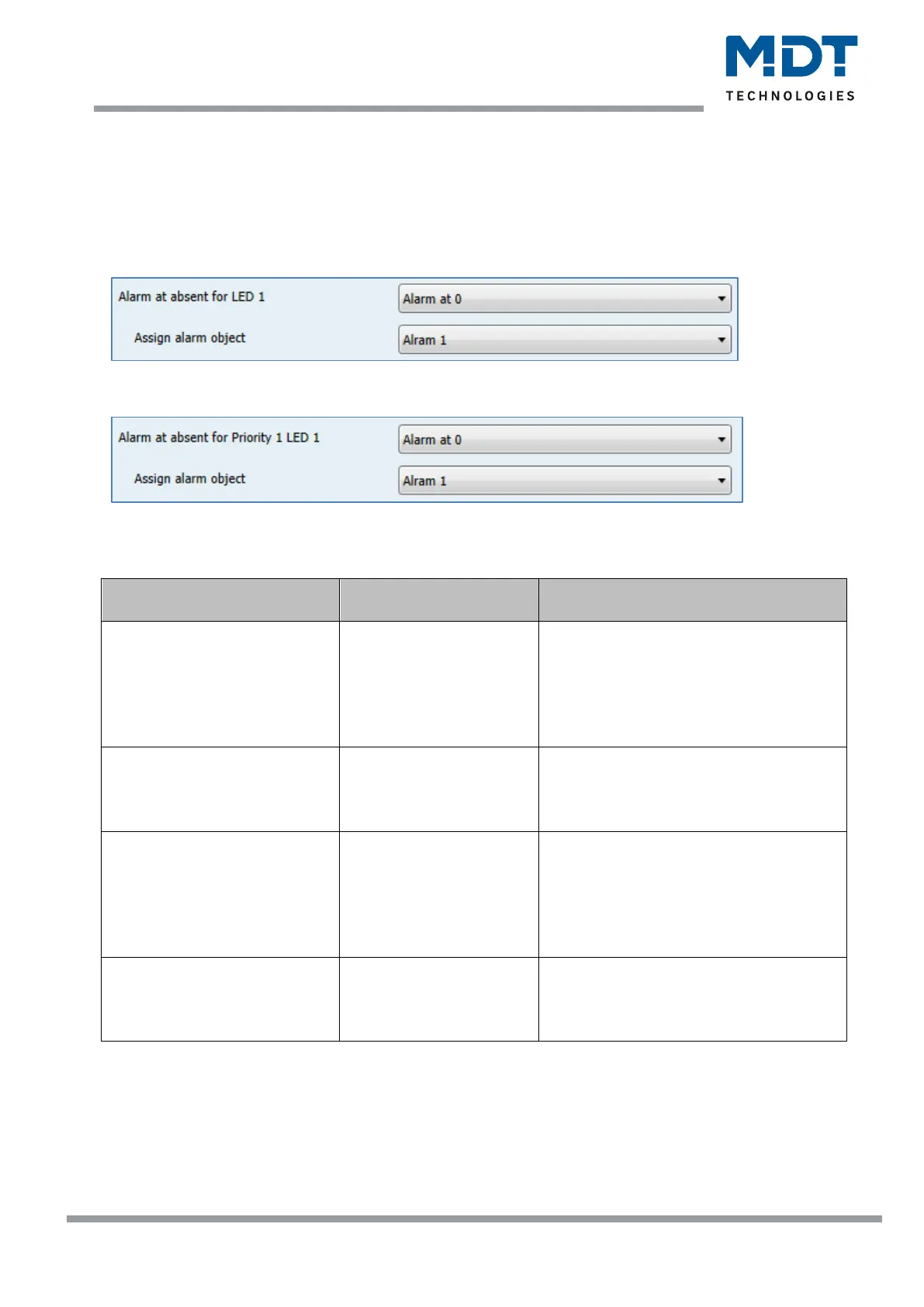 of four freely adjustable alarm objects. Both the LEDs and the LED 1 priority of all LEDs can be