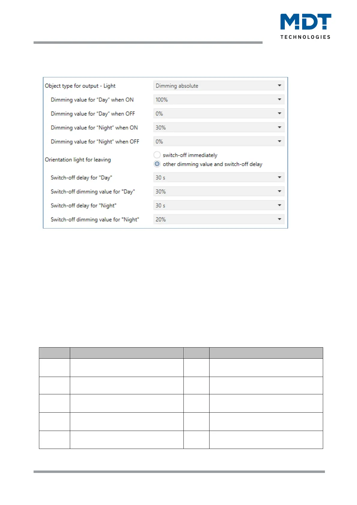 With the dimming values for Day/Night for ON/OFF, the corresponding absolute values are defined