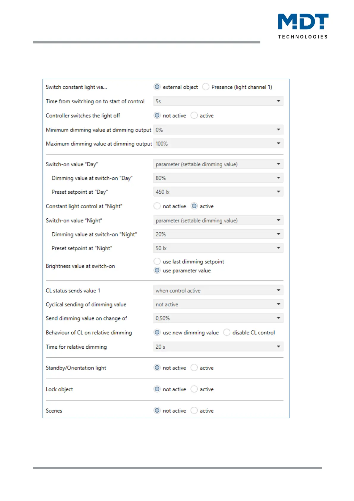 The following figure shows the available specific settings for the constant light control: