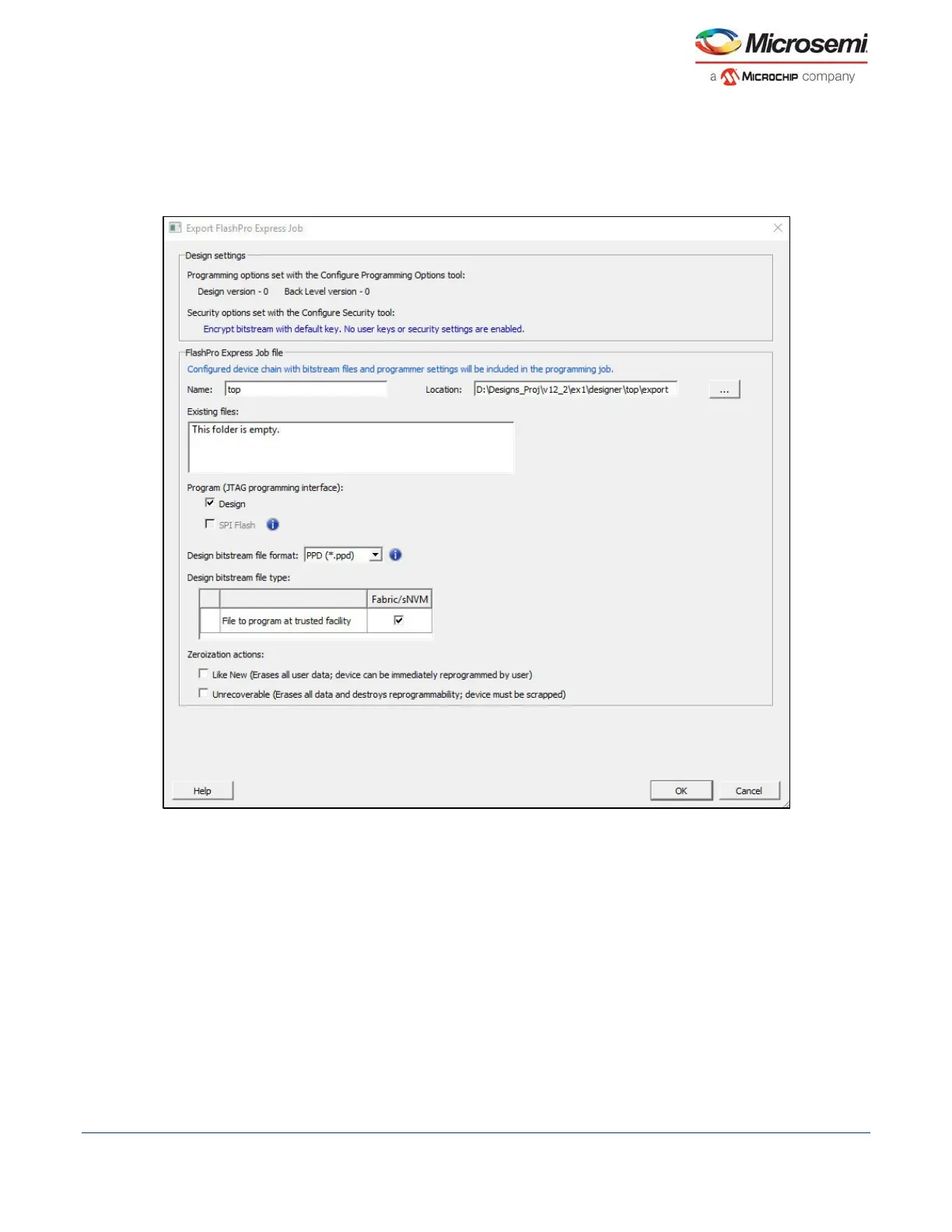 In Libero run Export FlashPro Express Job to create a container that will be used to transfer programming