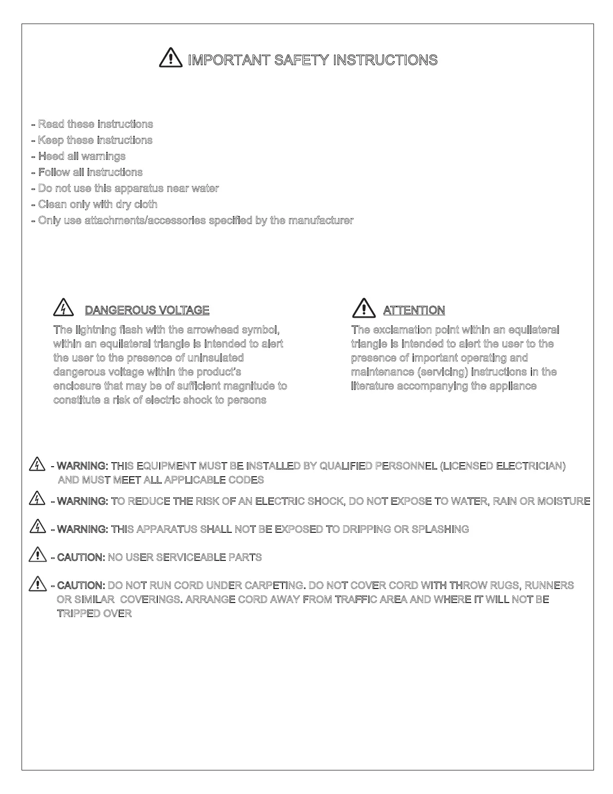 - WARNING: THIS EQUIPMENT MUST BE INSTALLED BY QUALIFIED PERSONNEL (LICENSED ELECTRICIAN)