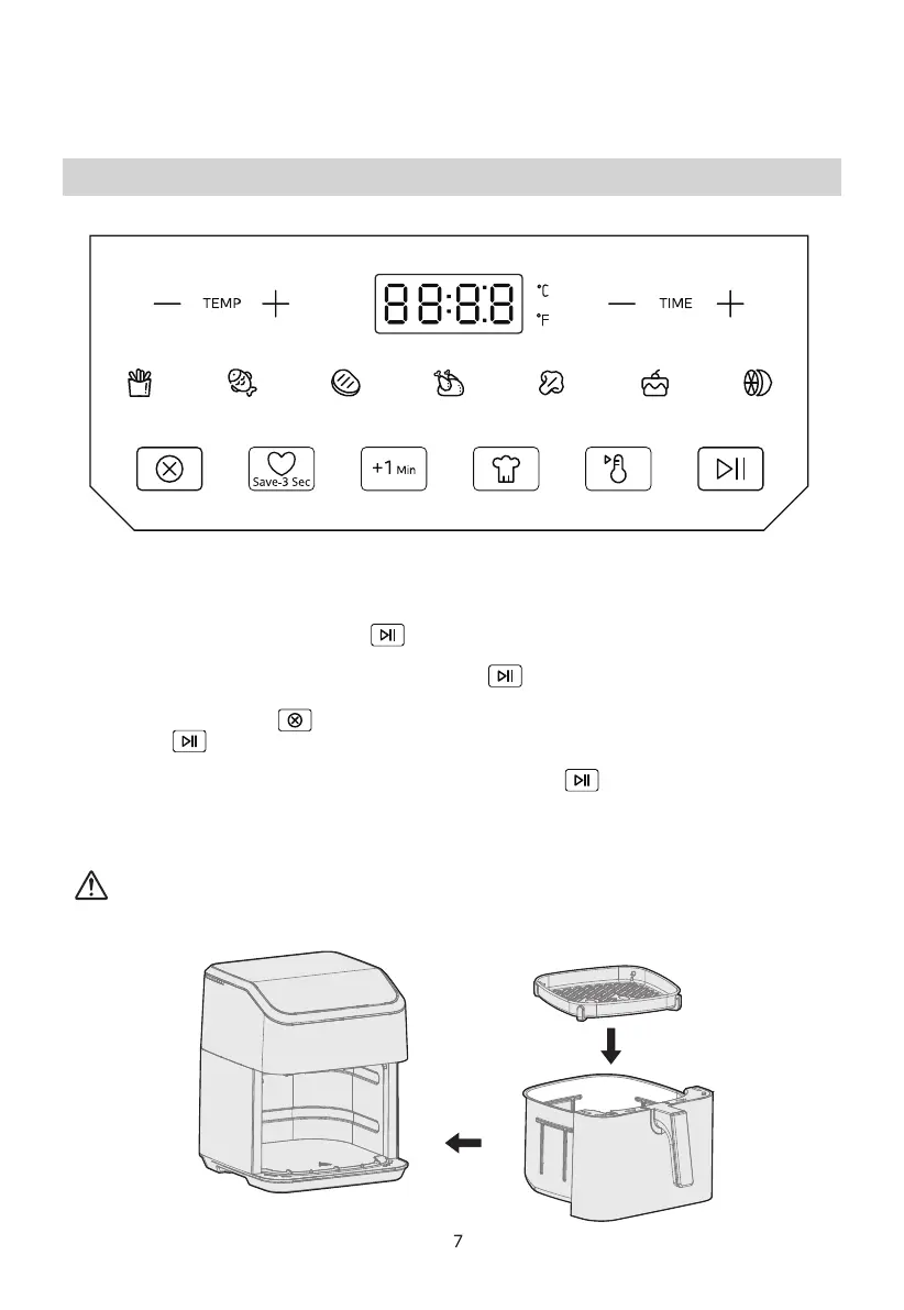 Click the key to enter the cooking pause; Click TEMP+, TEMP-, TIME+, TIME- to