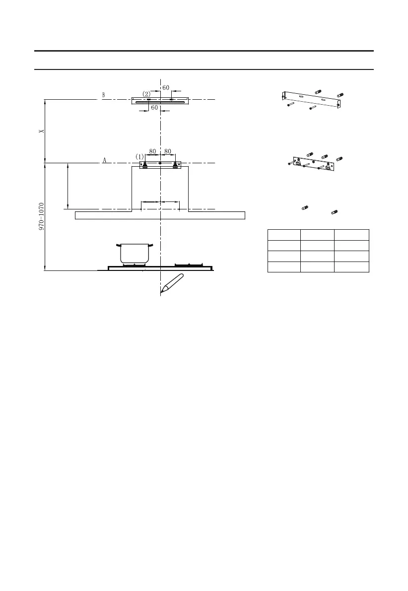 A horizontal line A at 970 – 1070 mm above the cooker top.
