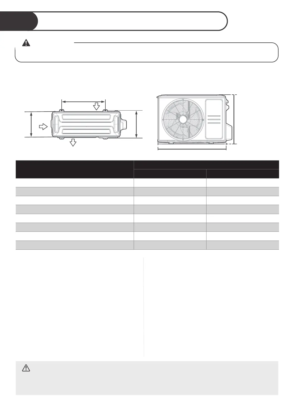 • Die folgende Liste zeigt verschiedene Größen von Außeneinheiten und den Abstand zwischen ihren