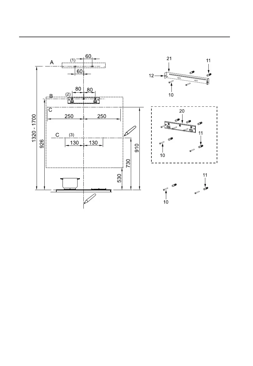 ● Une ligne horizontale A à 1320 - 1700 mm au-dessus de la plaque de cuisson.