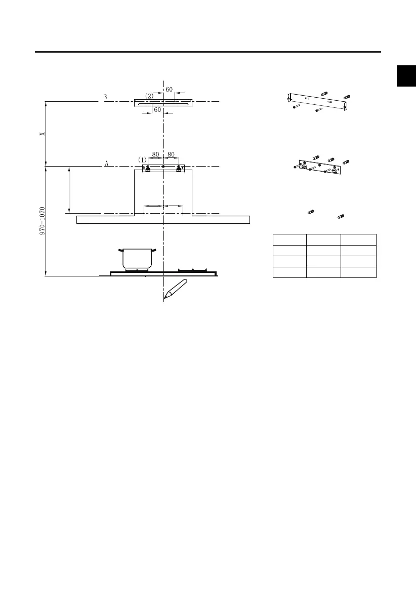 A horizontal line A at 970 – 1070 mm above the cooker top.