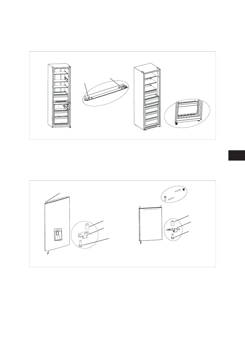 7. Umieścić drzwi komory chłodniczej na środkowym zawiasie. Zainstalować górny