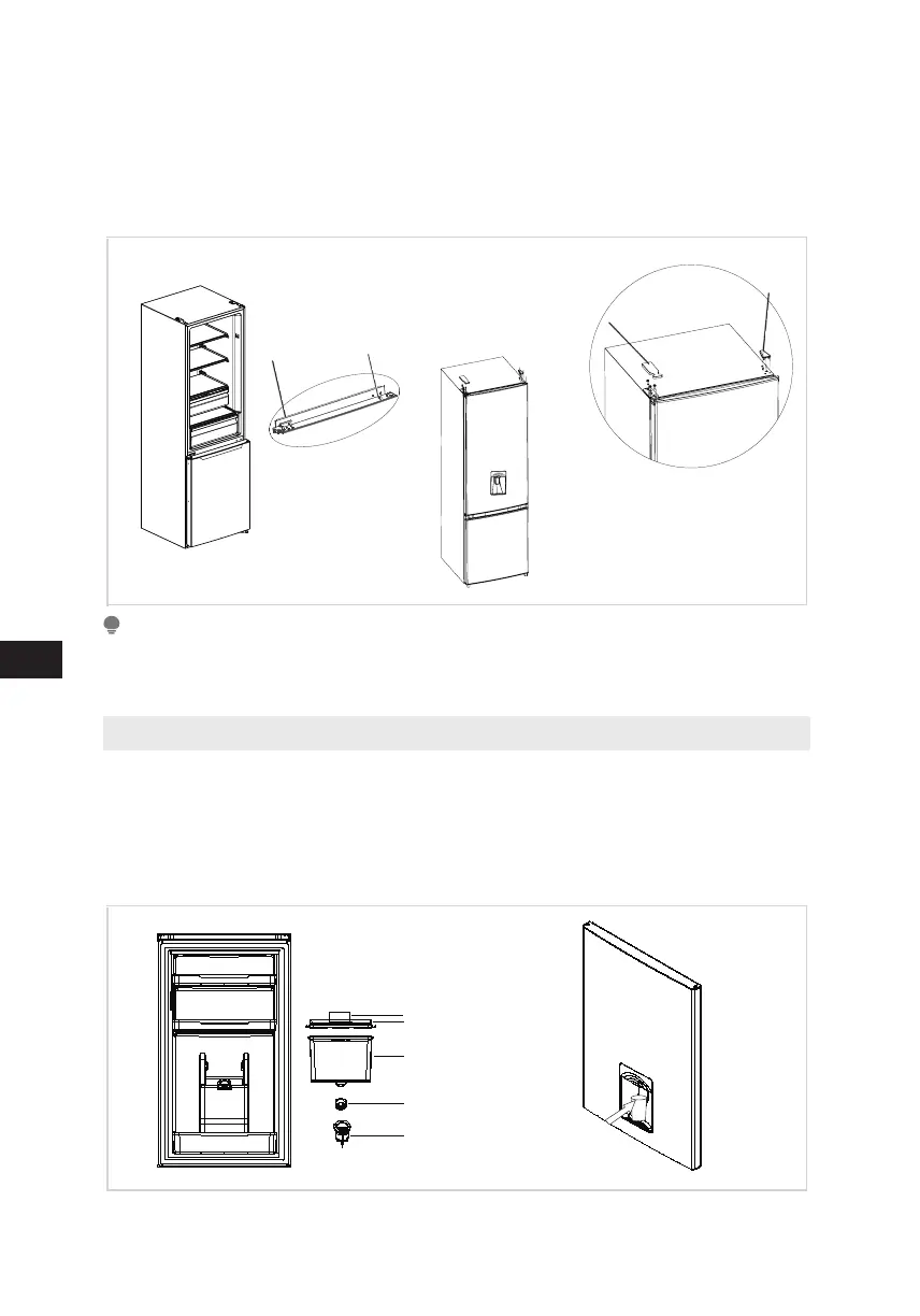 8. Nasaďte dvere chladiacej komory na stredný pánt, nainštalujte horný pánt, kryt
