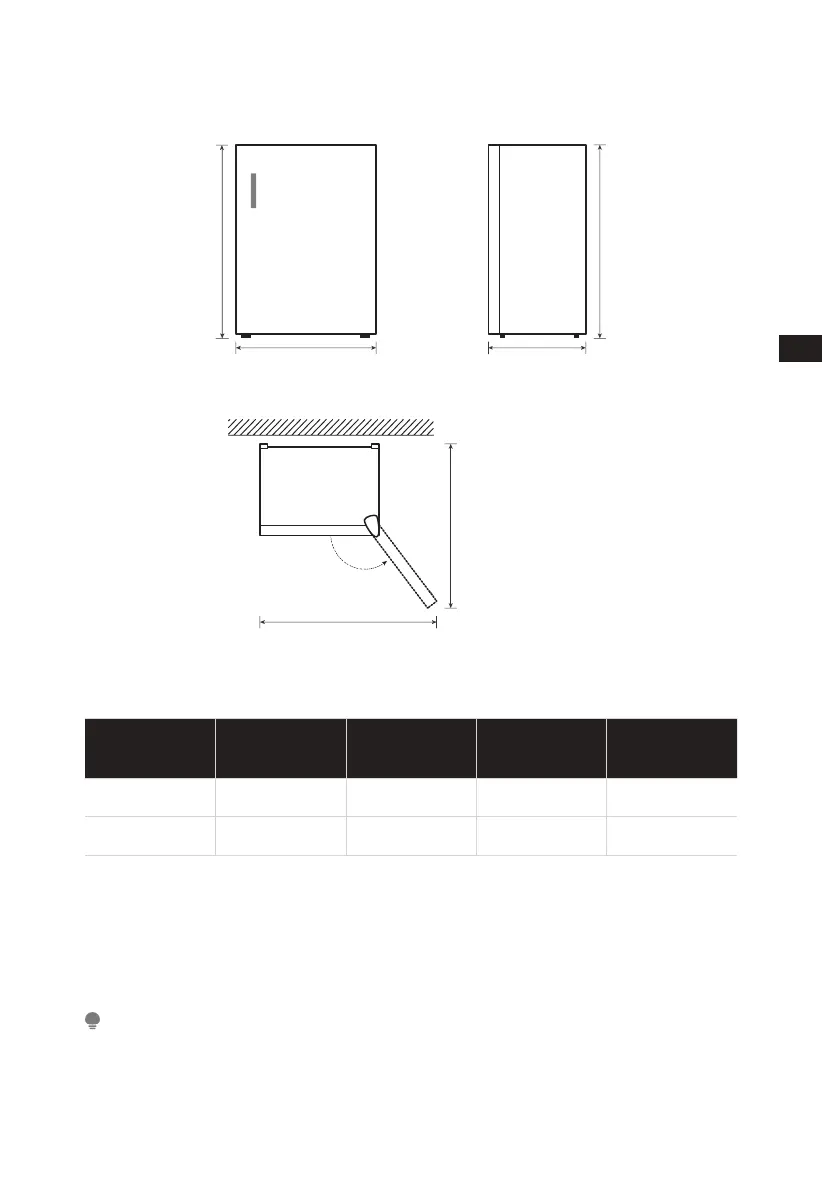 Disegno sui requisiti di spazio (quando lo sportello è aperto e quando è chiuso)