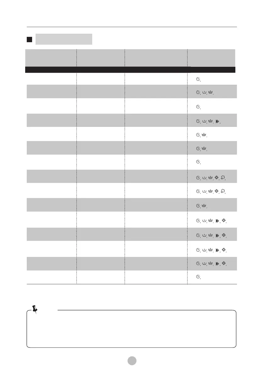 • The table shows which cycle offers which options for adjustment.