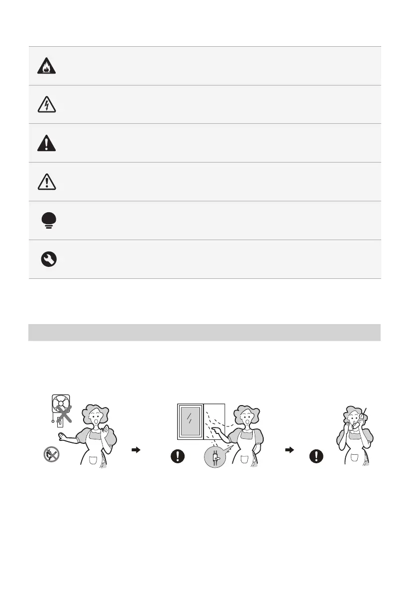 Do not switch on/off any electrical appliance and do not touch any electric plug.