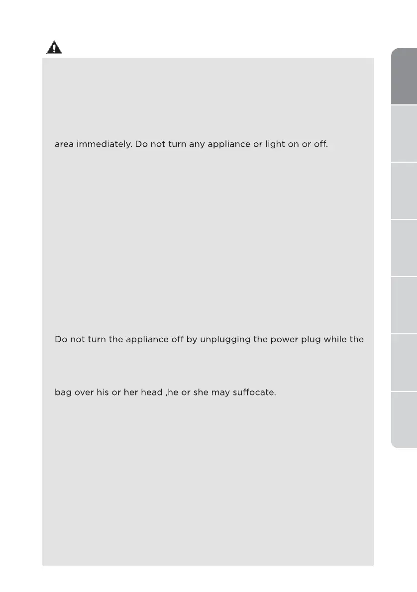 • In the event of a gas leak (such as propane or LP gas) ventilate the