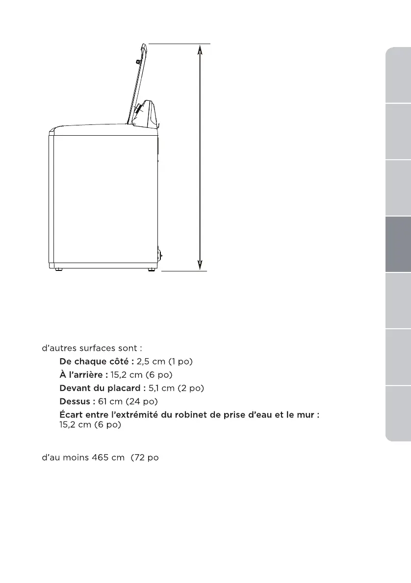 Les dégagements minimaux entre votre laveuse et les murs adjacents ou