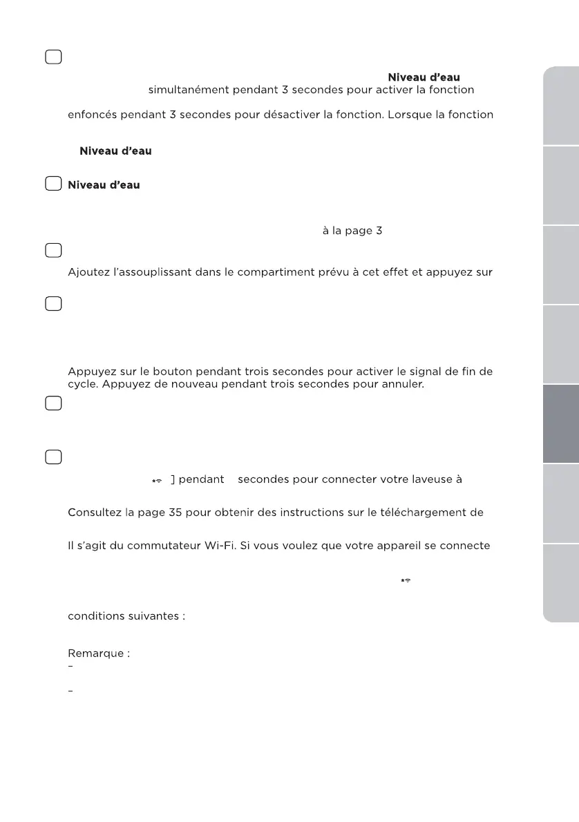 Appuyez pour sélectionner le niveau d’eau, la durée du lavage et le réglage du