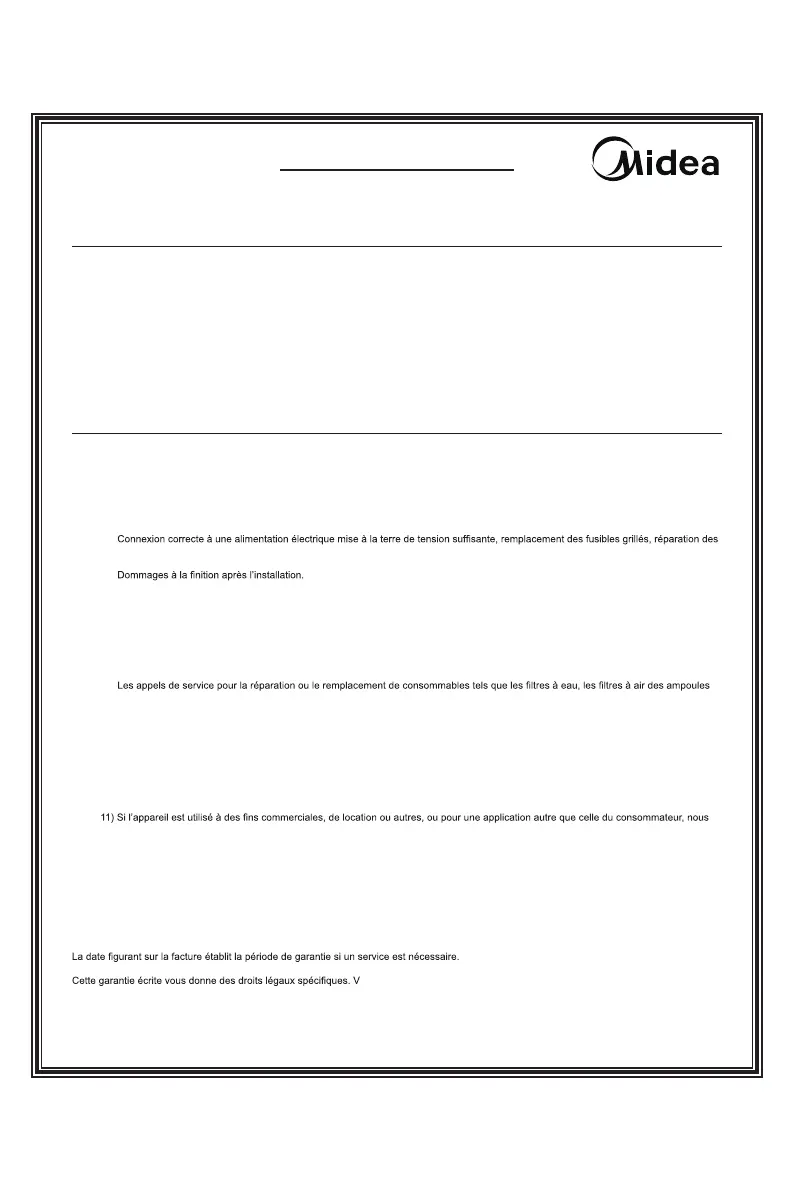 7) Dommages causés par des services effectués par des personnes autres que les réparateurs autorisés Midea ; utilisation de pièces
