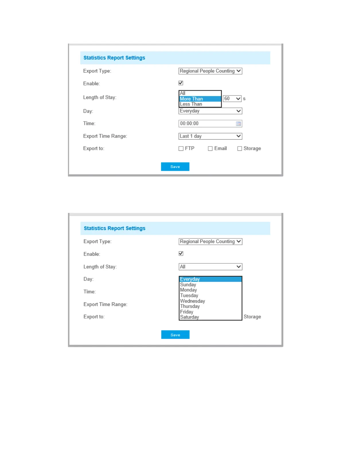 Set Time. User can choose the time of day to export the Statistics Report automatically, click