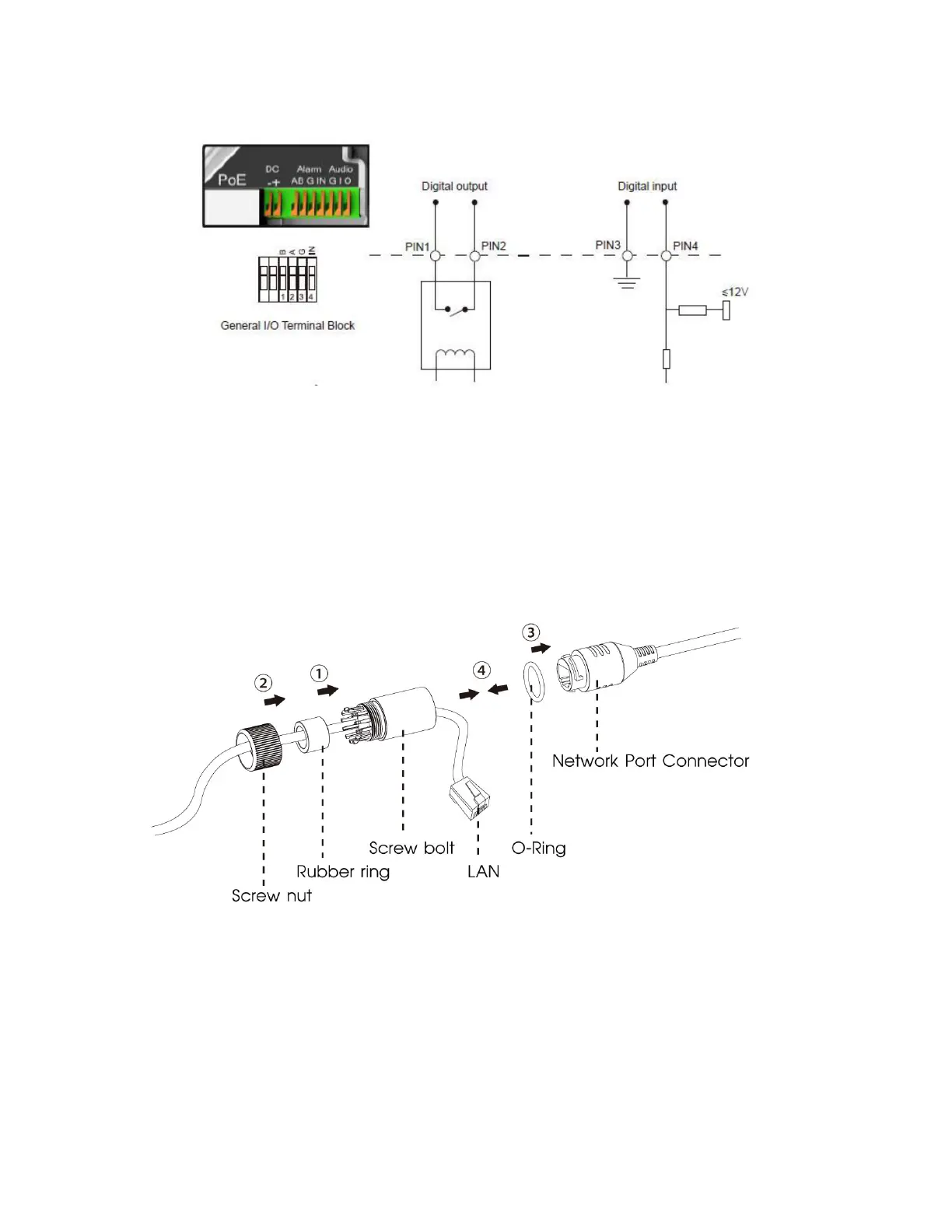 Step1: Get the network cable through the screw nut, rubber ring and the screw bolt.