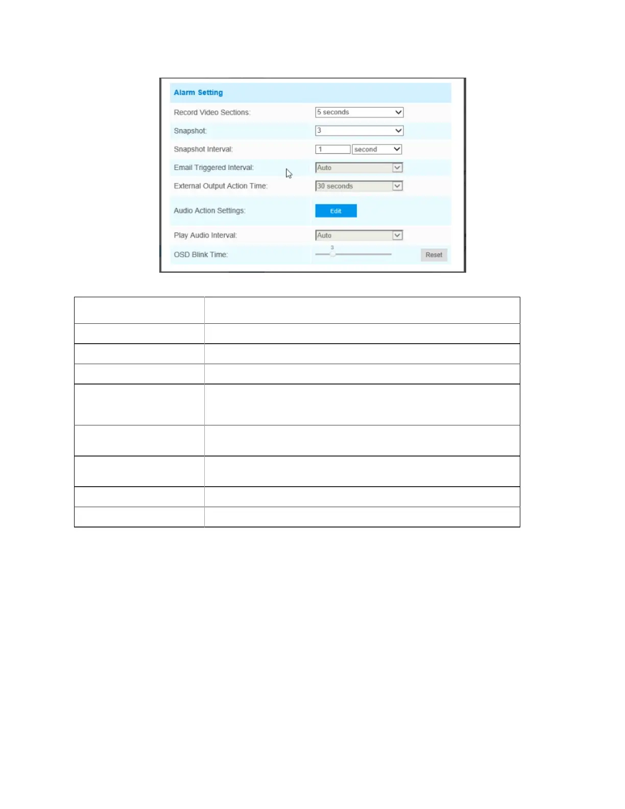 For example, the alarm action is set to OSD blinking at an interval of 3 seconds, when the data