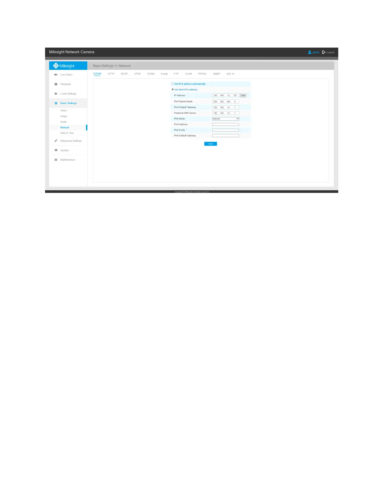 Step5: Change the IP address or other network values. Then click “Save” button;