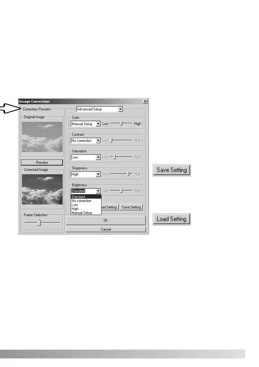 The advanced setup palette has five correction settings for color, contrast, saturation, sharpness, and