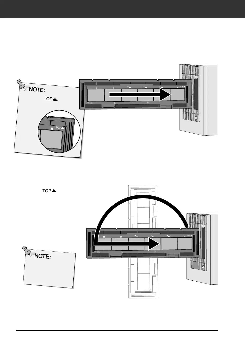 The notches in the film and slide holders identify the position of the scanning windows. Push