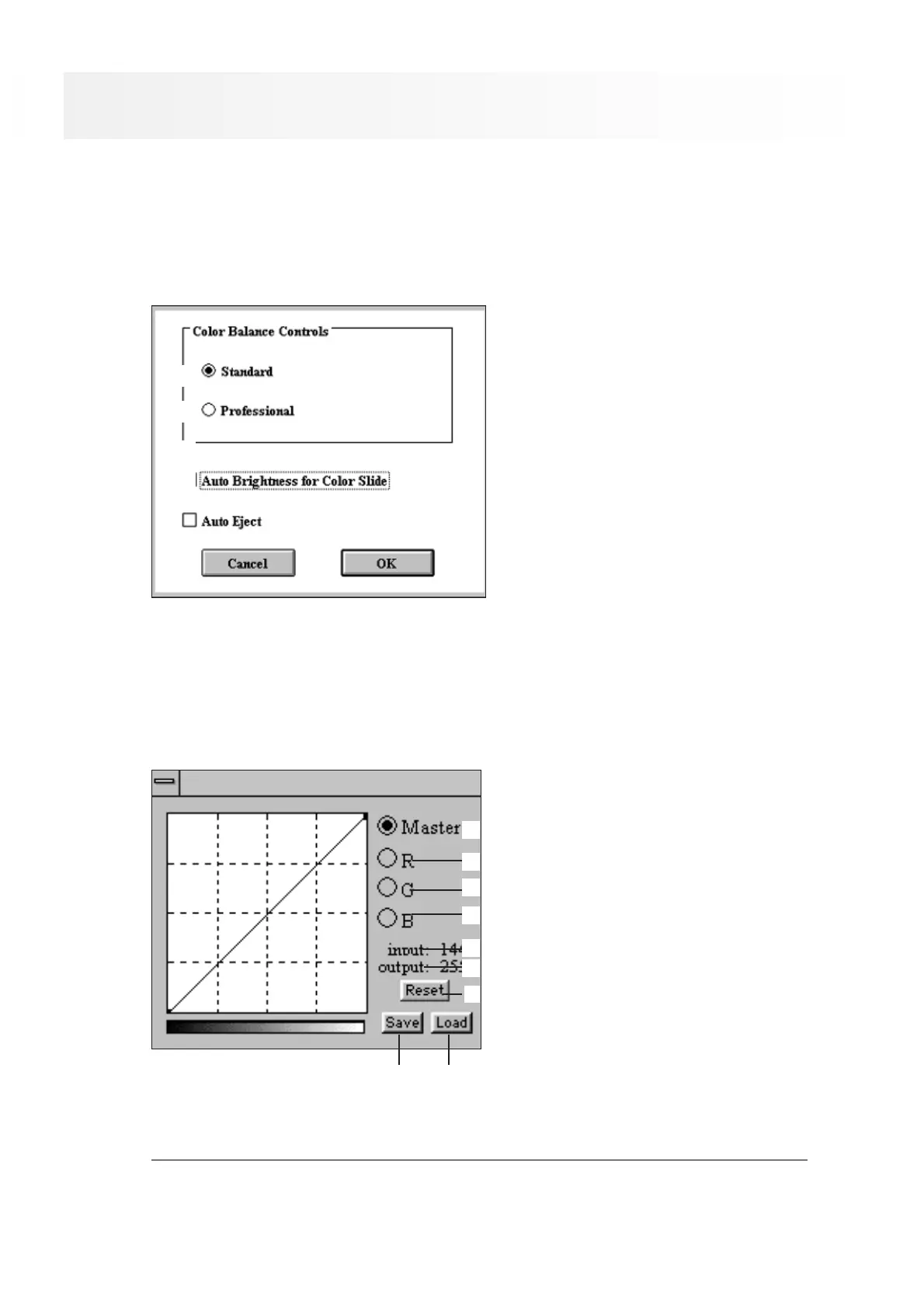 With the curves dialog box, you can control the brightness and color of the scanned image. Changes to all