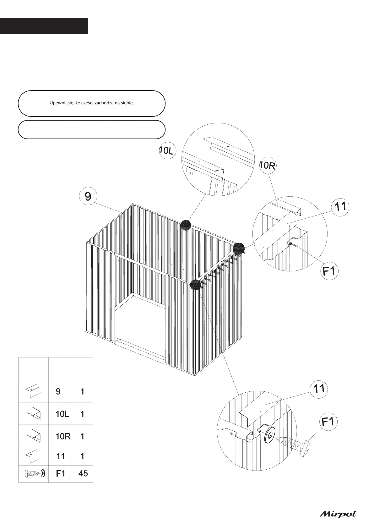 Umieść górne kątowniki (9), (10L), (10R) i (11) na