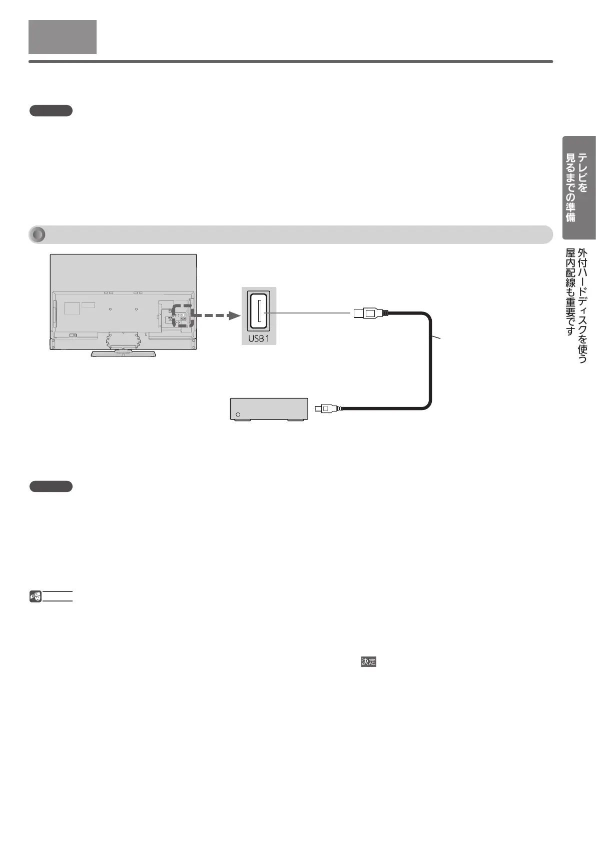 テレビ放送録画用の外付ハードディスクを接続してください。
