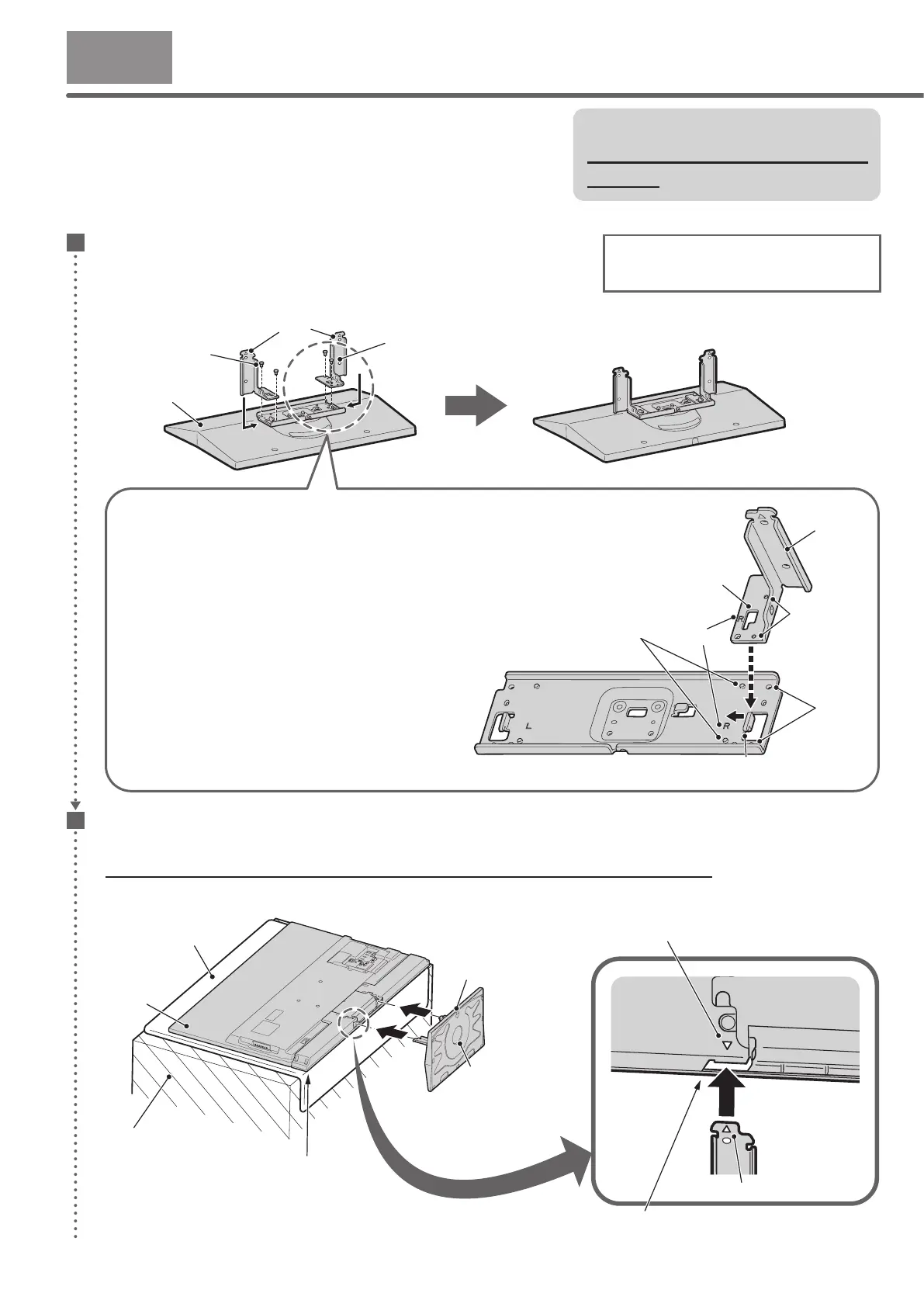 図のようにテレビ本体をふせて置いて、右図のようにスタンドの金属部分をテレビ本体に差し込む