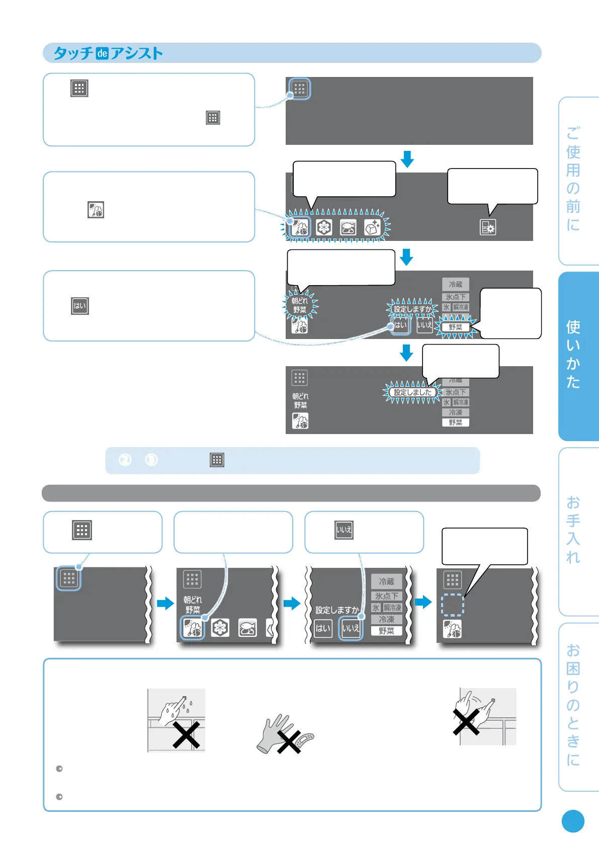 操作は手で行い、タッチした後は、表示が変わっていることを確認してから再度タッチしてください。