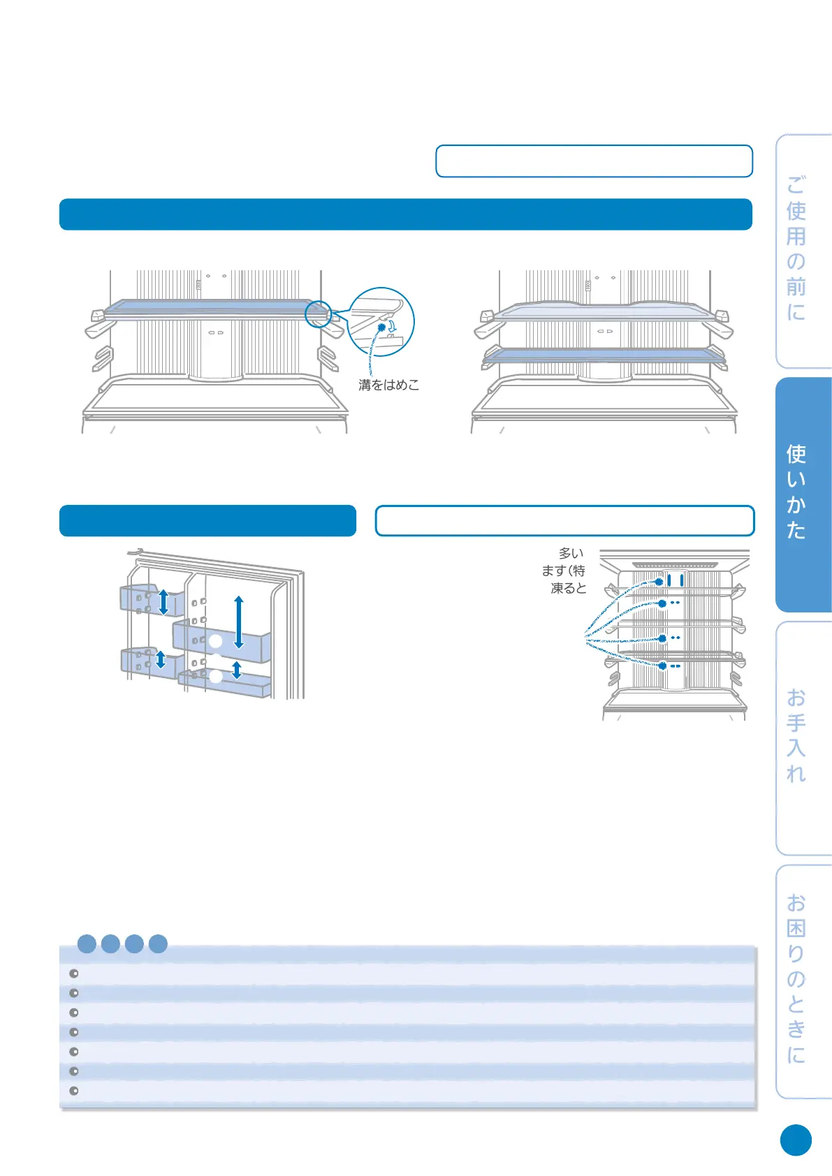 食品は上部まで積み上げず、天井や上の棚と食品の間に冷気が流れるよう、すき間をあけてください。