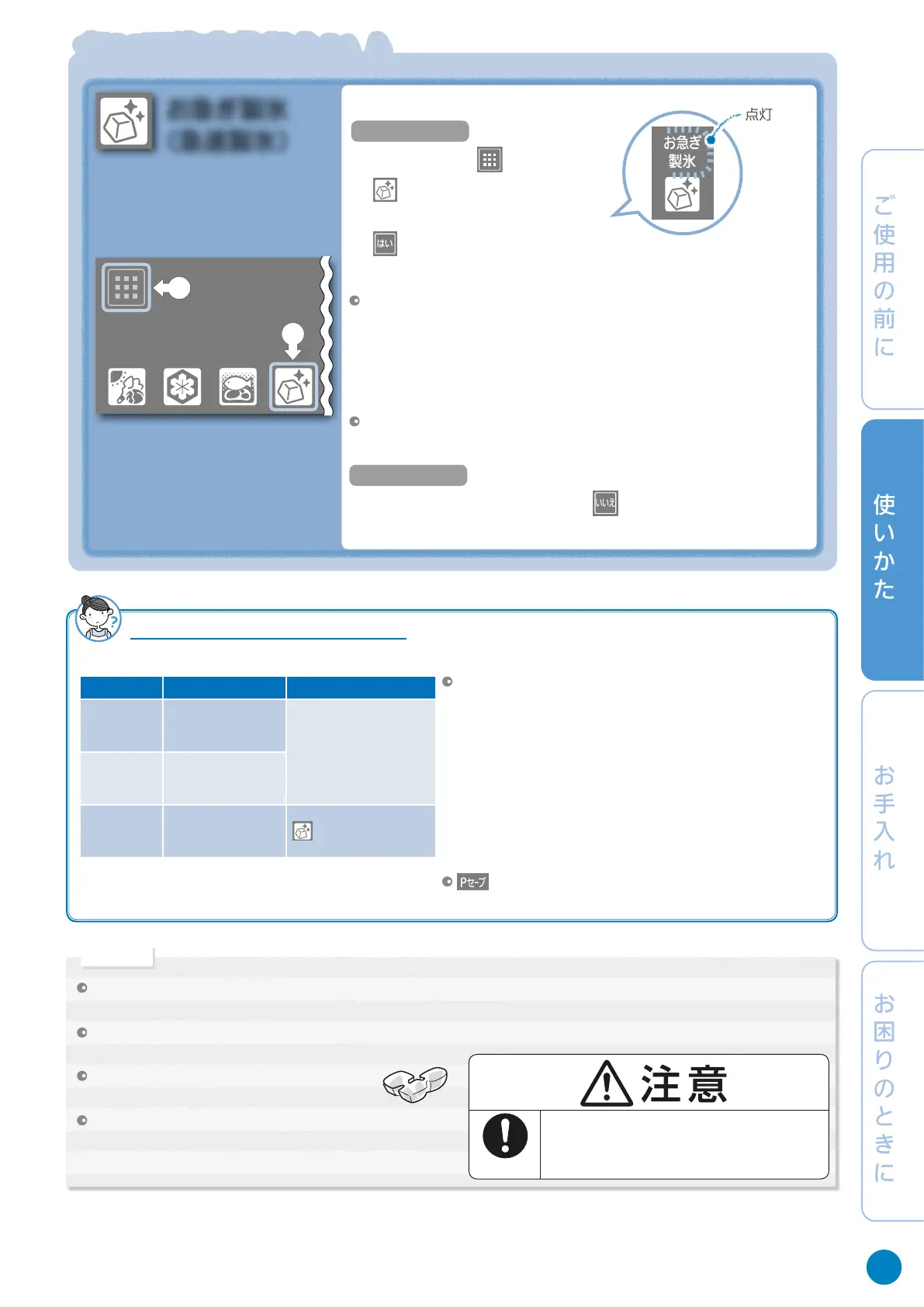 次のときは、お急ぎ製氷を自動的に終了し、アイコンの上の