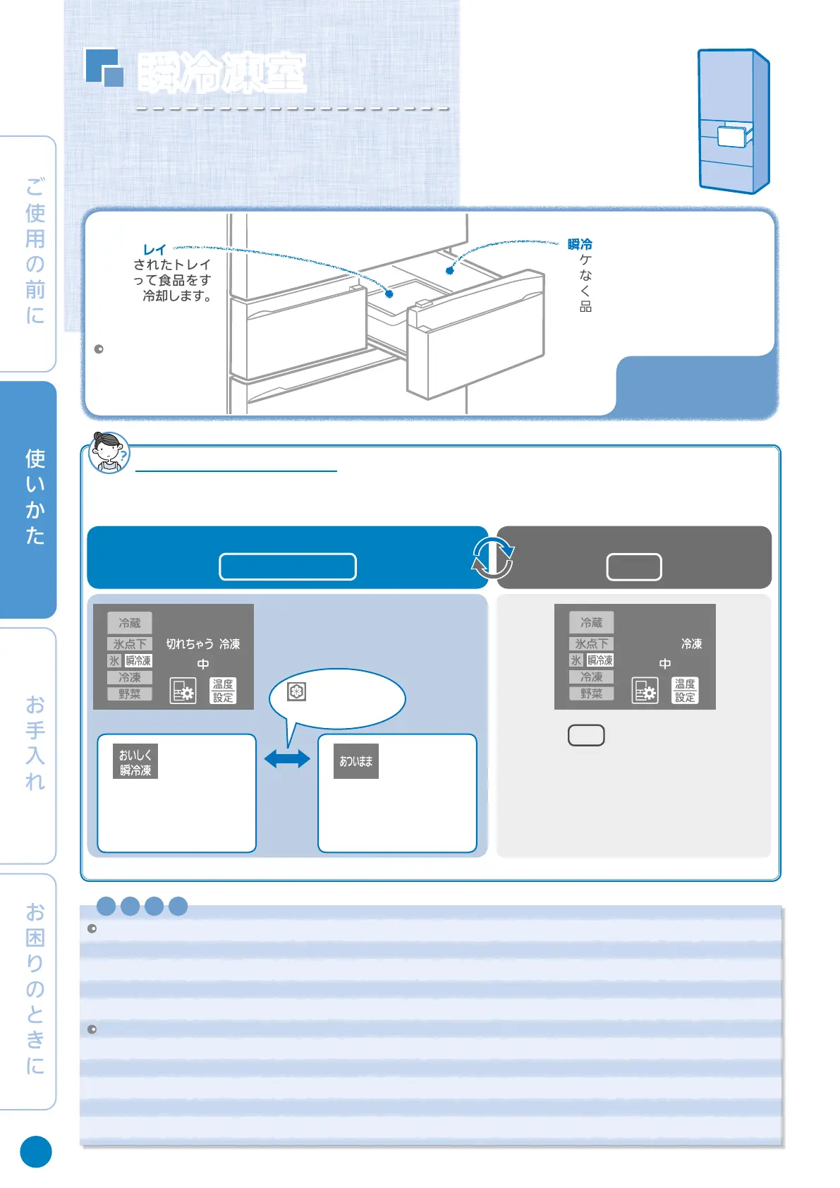 (ご購入時、瞬冷凍室は「切れちゃう冷凍」「 中」に設定されています。切替方法と用途