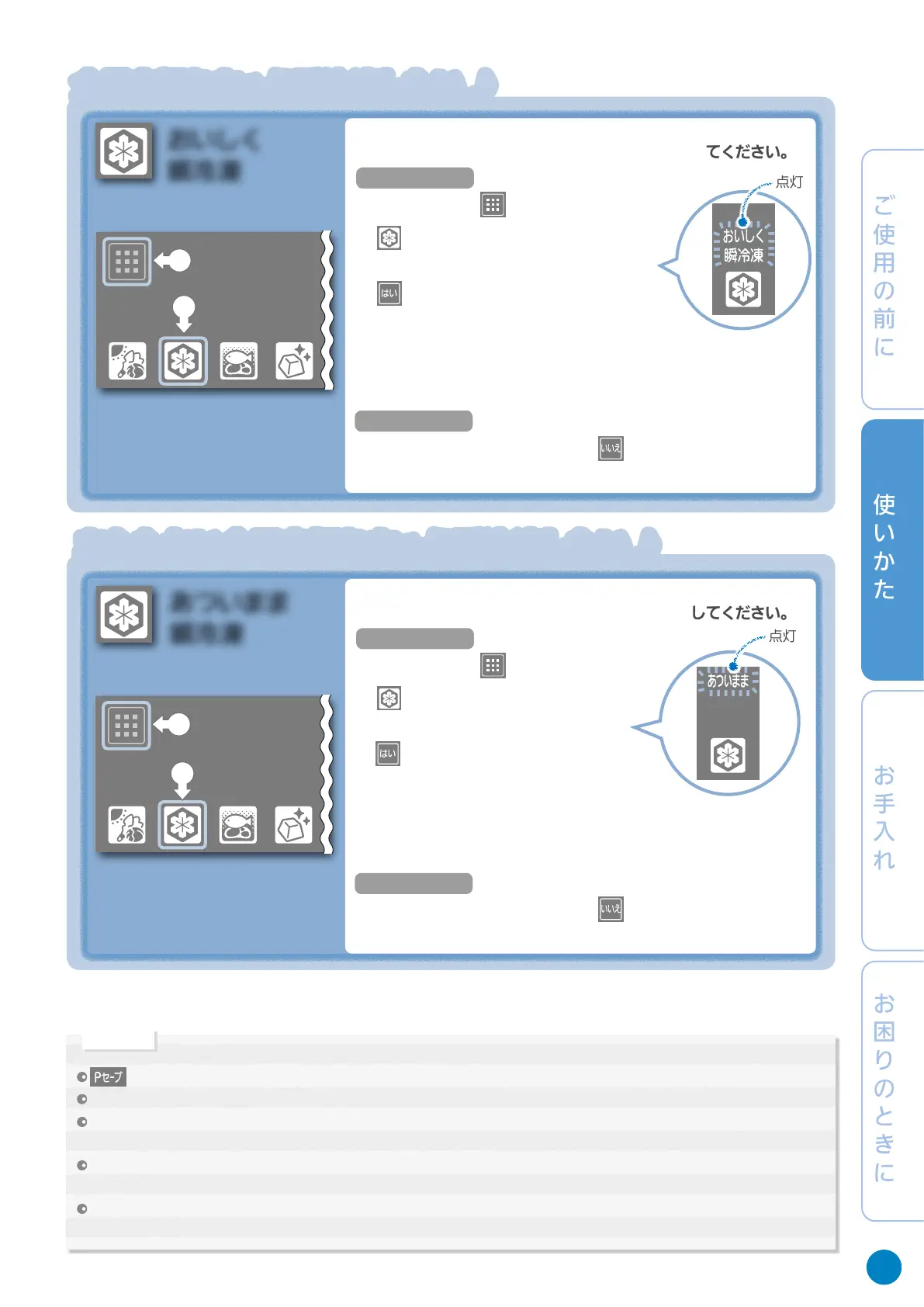 が表示されているときは「おいしく瞬冷凍」や「あついまま瞬冷凍」(以下、瞬冷凍)できません。➡ 25ページ