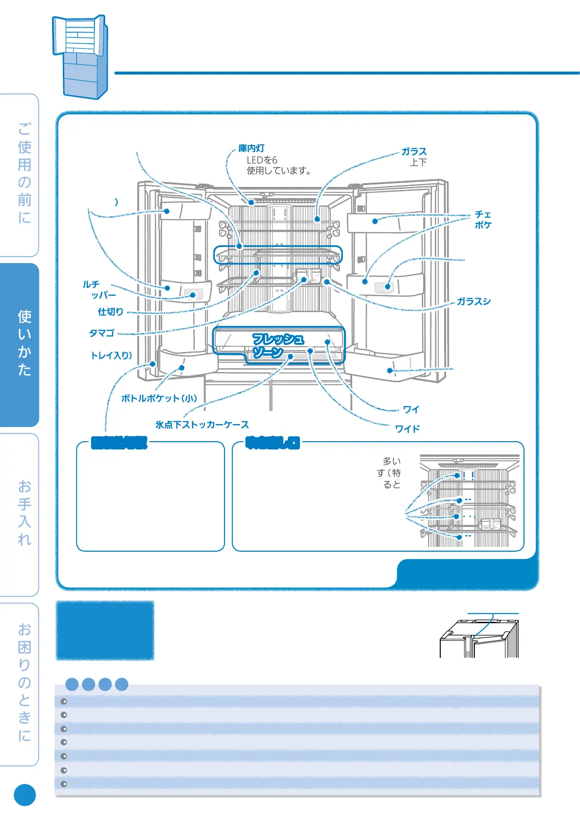 ガラス製の棚が割れたときは、割れたガラスに触れず、すぐにお買上げの販売店または修理窓口にご連絡ください。➡ 43ページ