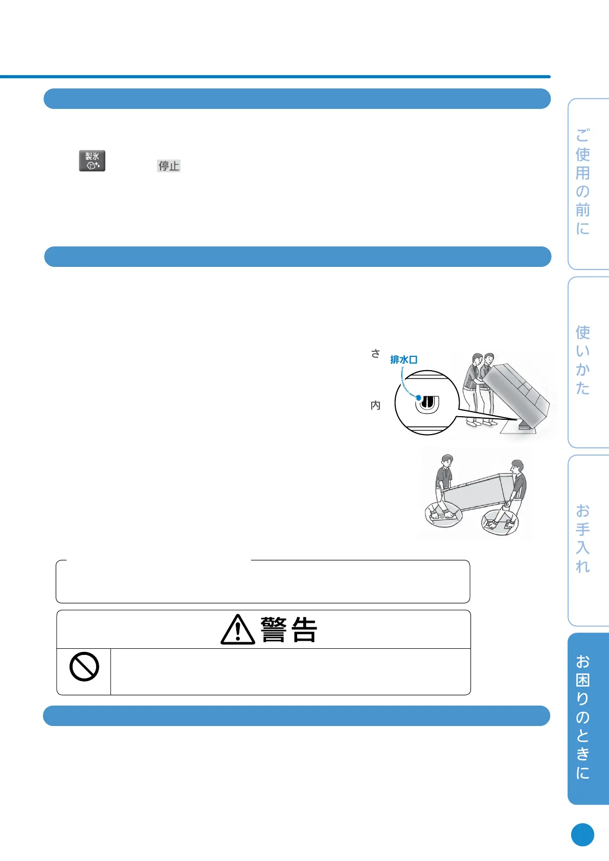 ❶給水タンク、製氷皿および貯氷箱の水や氷を捨てる。➡ 28〜29ページ